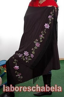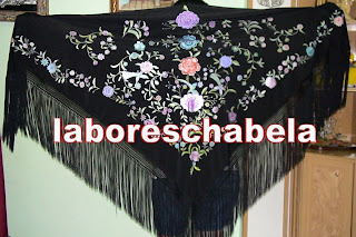 Al fin lo consegui ,primer trabajo terminado del 2011,chal negro pintado a mano con flores en blanco y plata,espero que os guste