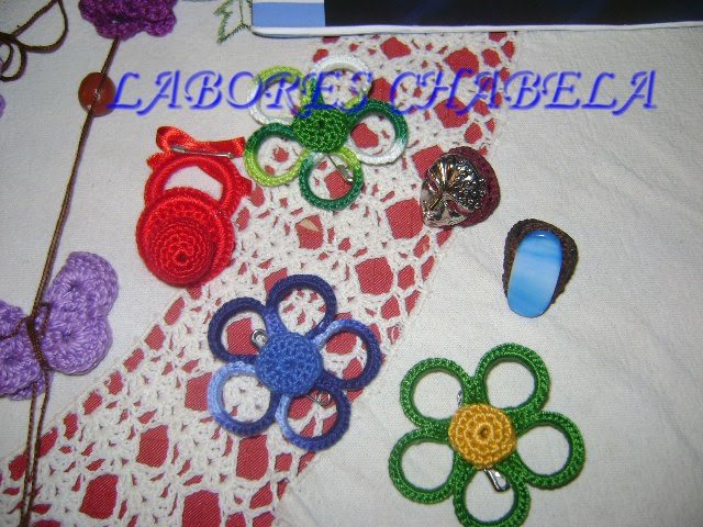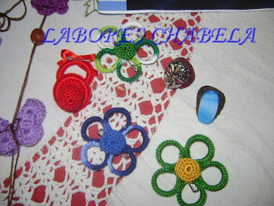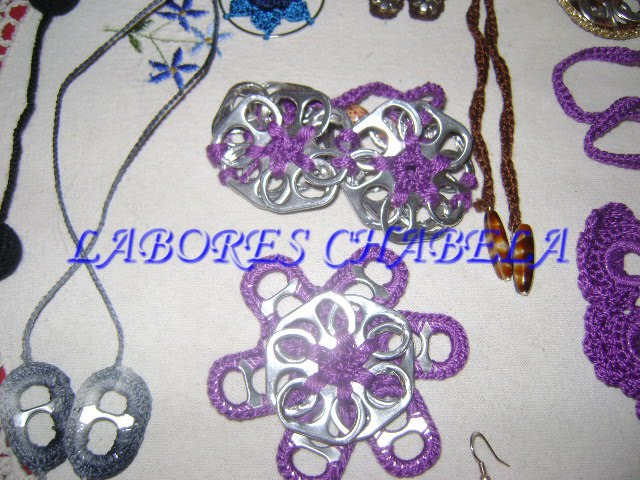 Hola amig@s, aqui les pongo esta maravilla de bisuteria que hace mi amiga Mari de Valencia. Si he puesto el letrero de labores chabela es con su autorización y las fotos fueron cedidas por ella. Con esta entrada quiero hacerle un homenaje, comenzóo siendo mi clienta y a dia de hoy somos buenas amigas, fue la que insistio en que aprendiera hacer el bolso mari con su ayuda claro, espero que disfruteis de las cosas bellas que hace reciclando anillas o lacre , anillas de los brick y mas cositas, como veis hay variedad de anillos, broches, collares, pendientes, todo hecho a ganchillo, espero les guste, a mi me encantan , un besin