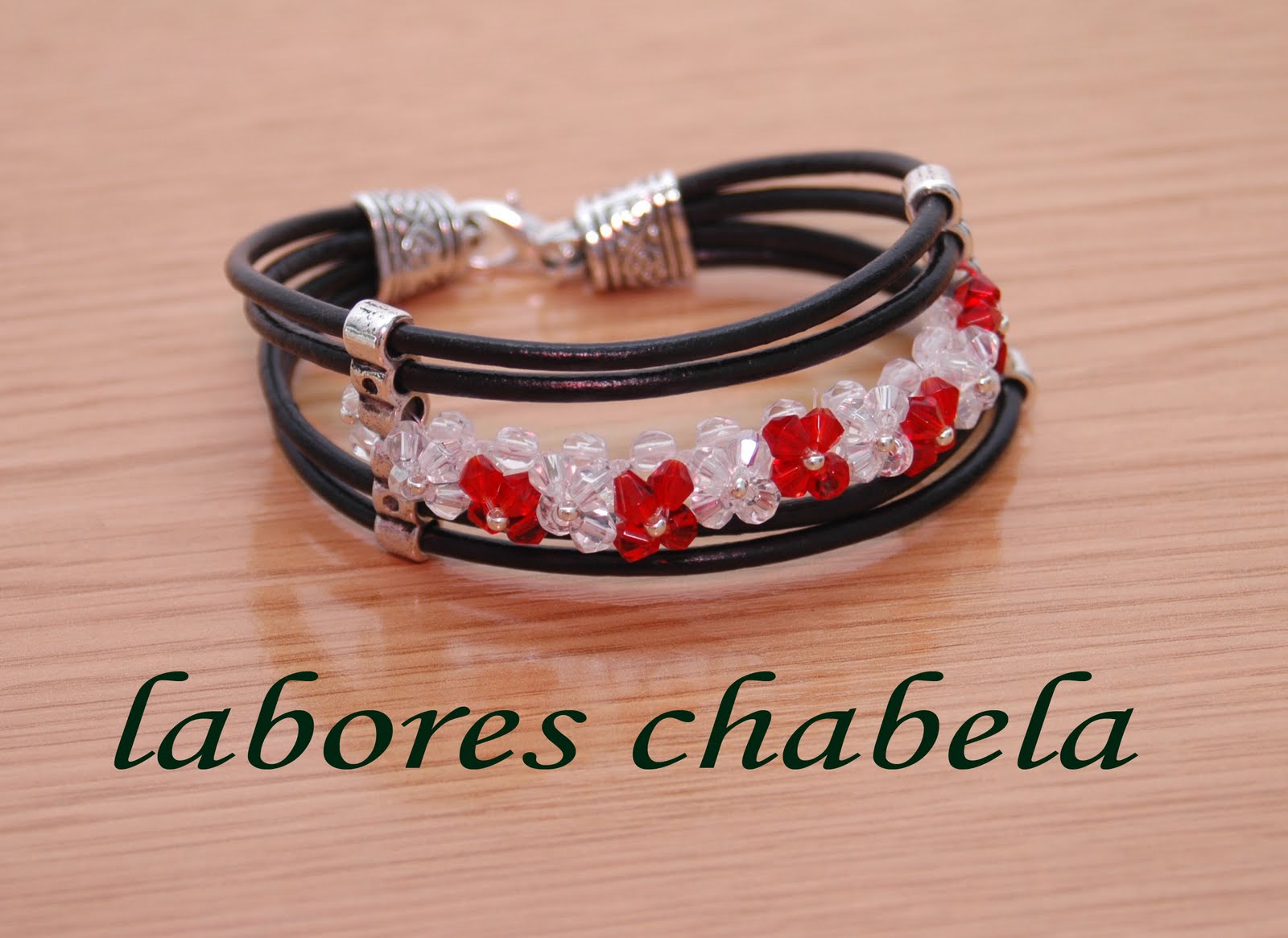 Esta pulcera esta realizada con cuero y tupís de Swarovski, se la he dedicado a mi madre, porque son los colores que a ella le gusta , darles las gracias a mis profes Lucia y Rosa del curso de abalorios al que voy, y en el que estoy aprendiendo mucho, segun me ha dicho Maribel una amiga del foro, esta pulcera se llama Cleopatra y su creadora es Angeles del blog Quien lo diria, gracias a ella tambien por inventarla, espero les guaste, un besin